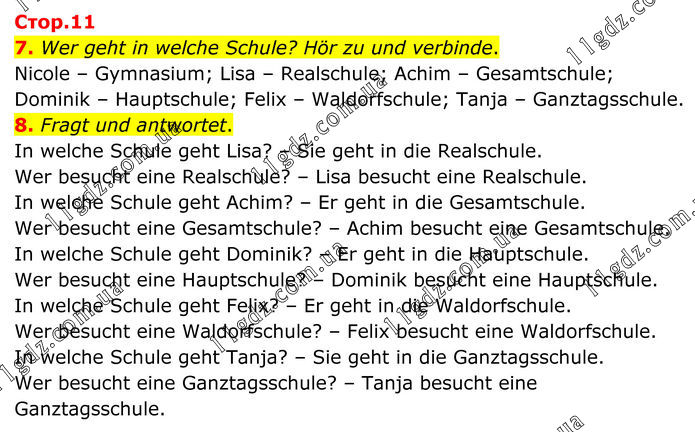 7. Wer geht in welche Schule? Hör zu und verbinde. Nicole – Gymnasium; Lisa – Realschule; Achim – Gesamtschule; Dominik – Hauptschule; Felix – Waldorfschule; Tanja – Ganztagsschule. 8. Fragt und antwortet. In welche Schule geht Lisa? – Sie geht in die Realschule. Wer besucht eine Realschule? – Lisa besucht eine Realschule. In welche Schule geht Achim? – Er geht in die Gesamtschule. Wer besucht eine Gesamtschule? – Achim besucht eine Gesamtschule. In welche Schule geht Dominik? – Er geht in die Hauptschule. Wer besucht eine Hauptschule? – Dominik besucht eine Hauptschule. In welche Schule geht Felix? – Er geht in die Waldorfschule. Wer besucht eine Waldorfschule? – Felix besucht eine Waldorfschule. In welche Schule geht Tanja? – Sie geht in die Ganztagsschule. Wer besucht eine Ganztagsschule? – Tanja besucht eine Ganztagsschule.