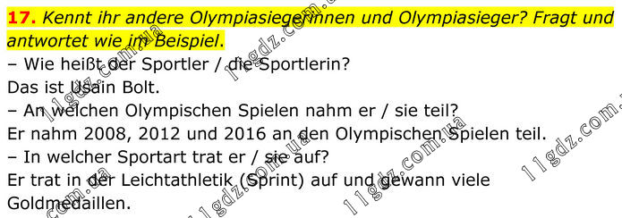 17. Kennt ihr andere Olympiasiegerinnen und Olympiasieger? Fragt und antwortet wie im Beispiel. – Wie heißt der Sportler / die Sportlerin? Das ist Usain Bolt. – An welchen Olympischen Spielen nahm er / sie teil? Er nahm 2008, 2012 und 2016 an den Olympischen Spielen teil. – In welcher Sportart trat er / sie auf? Er trat in der Leichtathletik (Sprint) auf und gewann viele Goldmedaillen.