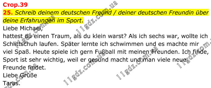 25. Schreib deinem deutschen Freund / deiner deutschen Freundin über deine Erfahrungen im Sport. Liebe Michael, hattest du einen Traum, als du klein warst? Als ich sechs war, wollte ich Schlittschuh laufen. Später lernte ich schwimmen und es machte mir viel Spaß. Heute spiele ich gern Fußball mit meinen Freunden. Ich finde, Sport ist sehr wichtig, weil er gesund macht und man viele neue Freunde findet. Liebe Grüße Taras.