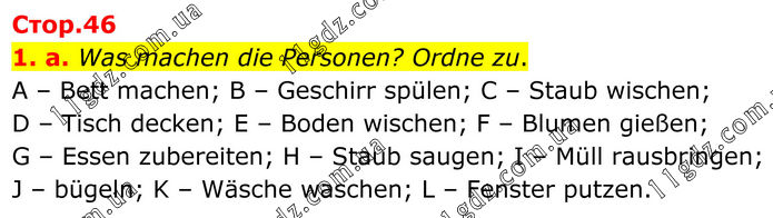 1. a. Was machen die Personen? Ordne zu. A – Bett machen; B – Geschirr spülen; C – Staub wischen; D – Tisch decken; E – Boden wischen; F – Blumen gießen; G – Essen zubereiten; H – Staub saugen; I – Müll rausbringen; J – bügeln; K – Wäsche waschen; L – Fenster putzen.