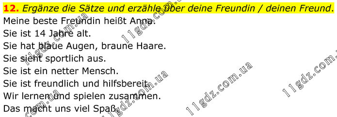 12. Ergänze die Sätze und erzähle über deine Freundin / deinen Freund. Meine beste Freundin heißt Anna. Sie ist 14 Jahre alt. Sie hat blaue Augen, braune Haare. Sie sieht sportlich aus. Sie ist ein netter Mensch. Sie ist freundlich und hilfsbereit. Wir lernen und spielen zusammen. Das macht uns viel Spaß.
