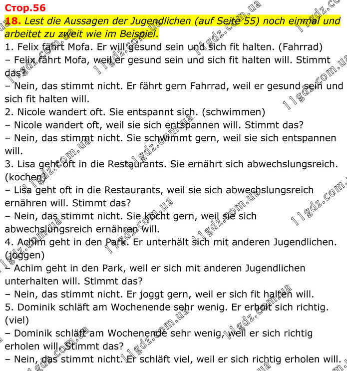 18. Lest die Aussagen der Jugendlichen (auf Seite 55) noch einmal und arbeitet zu zweit wie im Beispiel. 1. Felix fährt Mofa. Er will gesund sein und sich fit halten. (Fahrrad) – Felix fährt Mofa, weil er gesund sein und sich fit halten will. Stimmt das? – Nein, das stimmt nicht. Er fährt gern Fahrrad, weil er gesund sein und sich fit halten will. 2. Nicole wandert oft. Sie entspannt sich. (schwimmen) – Nicole wandert oft, weil sie sich entspannen will. Stimmt das? – Nein, das stimmt nicht. Sie schwimmt gern, weil sie sich entspannen will. 3. Lisa geht oft in die Restaurants. Sie ernährt sich abwechslungsreich. (kochen) – Lisa geht oft in die Restaurants, weil sie sich abwechslungsreich ernähren will. Stimmt das? – Nein, das stimmt nicht. Sie kocht gern, weil sie sich abwechslungsreich ernähren will. 4. Achim geht in den Park. Er unterhält sich mit anderen Jugendlichen. (joggen) – Achim geht in den Park, weil er sich mit anderen Jugendlichen unterhalten will. Stimmt das? – Nein, das stimmt nicht. Er joggt gern, weil er sich fit halten will. 5. Dominik schläft am Wochenende sehr wenig. Er erholt sich richtig. (viel) – Dominik schläft am Wochenende sehr wenig, weil er sich richtig erholen will. Stimmt das? – Nein, das stimmt nicht. Er schläft viel, weil er sich richtig erholen will.