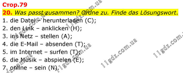 20. Was passt zusammen? Ordne zu. Finde das Lösungswort. 1. die Datei – herunterladen (C); 2. den Link – anklicken (H); 3. ins Netz – stellen (A); 4. die E-Mail – absenden (T); 5. im Internet – surfen (T); 6. die Musik – abspielen (E); 7. online – sein (N).