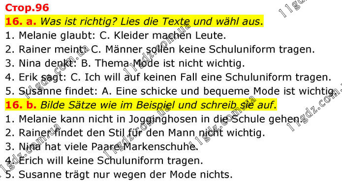 16. a. Was ist richtig? Lies die Texte und wähl aus. 1. Melanie glaubt: C. Kleider machen Leute. 2. Rainer meint: C. Männer sollen keine Schuluniform tragen. 3. Nina denkt: B. Thema Mode ist nicht wichtig. 4. Erik sagt: C. Ich will auf keinen Fall eine Schuluniform tragen. 5. Susanne findet: A. Eine schicke und bequeme Mode ist wichtig. 16. b. Bilde Sätze wie im Beispiel und schreib sie auf. 1. Melanie kann nicht in Jogginghosen in die Schule gehen. 2. Rainer findet den Stil für den Mann nicht wichtig. 3. Nina hat viele Paare Markenschuhe. 4. Erich will keine Schuluniform tragen. 5. Susanne trägt nur wegen der Mode nichts.