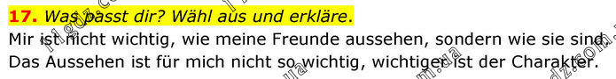 17. Was passt dir? Wähl aus und erkläre. Mir ist nicht wichtig, wie meine Freunde aussehen, sondern wie sie sind. Das Aussehen ist für mich nicht so wichtig, wichtiger ist der Charakter.