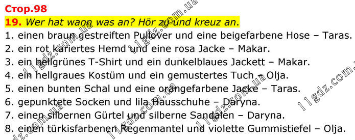 19. Wer hat wann was an? Hör zu und kreuz an. 1. einen braun gestreiften Pullover und eine beigefarbene Hose – Taras. 2. ein rot kariertes Hemd und eine rosa Jacke – Makar. 3. ein hellgrünes T-Shirt und ein dunkelblaues Jackett – Makar. 4. ein hellgraues Kostüm und ein gemustertes Tuch – Olja. 5. einen bunten Schal und eine orangefarbene Jacke – Taras. 6. gepunktete Socken und lila Hausschuhe – Daryna. 7. einen silbernen Gürtel und silberne Sandalen – Daryna. 8. einen türkisfarbenen Regenmantel und violette Gummistiefel – Olja.