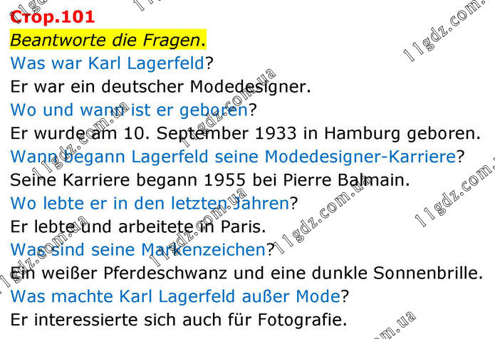 Стор.101 Beantworte die Fragen. Was war Karl Lagerfeld? Er war ein deutscher Modedesigner. Wo und wann ist er geboren? Er wurde am 10. September 1933 in Hamburg geboren. Wann begann Lagerfeld seine Modedesigner-Karriere? Seine Karriere begann 1955 bei Pierre Balmain. Wo lebte er in den letzten Jahren? Er lebte und arbeitete in Paris. Was sind seine Markenzeichen? Ein weißer Pferdeschwanz und eine dunkle Sonnenbrille. Was machte Karl Lagerfeld außer Mode? Er interessierte sich auch für Fotografie.
