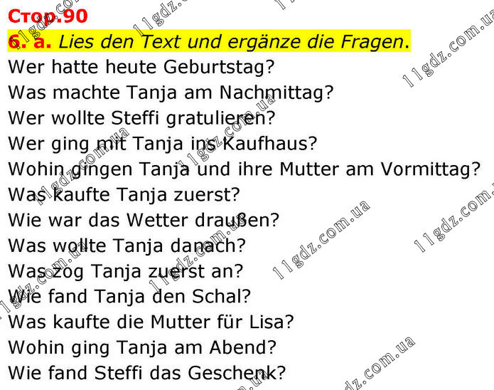 6. a. Lies den Text und ergänze die Fragen. Wer hatte heute Geburtstag? Was machte Tanja am Nachmittag? Wer wollte Steffi gratulieren? Wer ging mit Tanja ins Kaufhaus? Wohin gingen Tanja und ihre Mutter am Vormittag? Was kaufte Tanja zuerst? Wie war das Wetter draußen? Was wollte Tanja danach? Was zog Tanja zuerst an? Wie fand Tanja den Schal? Was kaufte die Mutter für Lisa? Wohin ging Tanja am Abend? Wie fand Steffi das Geschenk?
