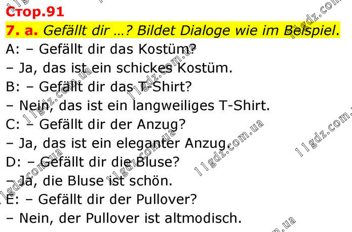 7. a. Gefällt dir …? Bildet Dialoge wie im Beispiel. A: – Gefällt dir das Kostüm? – Ja, das ist ein schickes Kostüm. B: – Gefällt dir das T-Shirt? – Nein, das ist ein langweiliges T-Shirt. C: – Gefällt dir der Anzug? – Ja, das ist ein eleganter Anzug. D: – Gefällt dir die Bluse? – Ja, die Bluse ist schön. E: – Gefällt dir der Pullover? – Nein, der Pullover ist altmodisch.