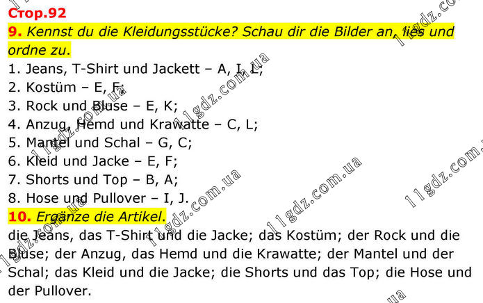 9. Kennst du die Kleidungsstücke? Schau dir die Bilder an, lies und ordne zu. 1. Jeans, T-Shirt und Jackett – A, I, L; 2. Kostüm – E, F; 3. Rock und Bluse – E, K; 4. Anzug, Hemd und Krawatte – C, L; 5. Mantel und Schal – G, C; 6. Kleid und Jacke – E, F; 7. Shorts und Top – B, A; 8. Hose und Pullover – I, J. 10. Ergänze die Artikel. die Jeans, das T-Shirt und die Jacke; das Kostüm; der Rock und die Bluse; der Anzug, das Hemd und die Krawatte; der Mantel und der Schal; das Kleid und die Jacke; die Shorts und das Top; die Hose und der Pullover.