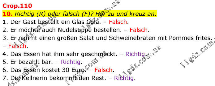 10. Richtig (R) oder falsch (F)? Hör zu und kreuz an. 1. Der Gast bestellt ein Glas Cola. – Falsch. 2. Er möchte auch Nudelsuppe bestellen. – Falsch. 3. Er nimmt einen großen Salat und Schweinebraten mit Pommes frites. – Falsch. 4. Das Essen hat ihm sehr geschmeckt. – Richtig. 5. Er bezahlt bar. – Richtig. 6. Das Essen kostet 30 Euro. – Falsch. 7. Die Kellnerin bekommt den Rest. – Richtig.