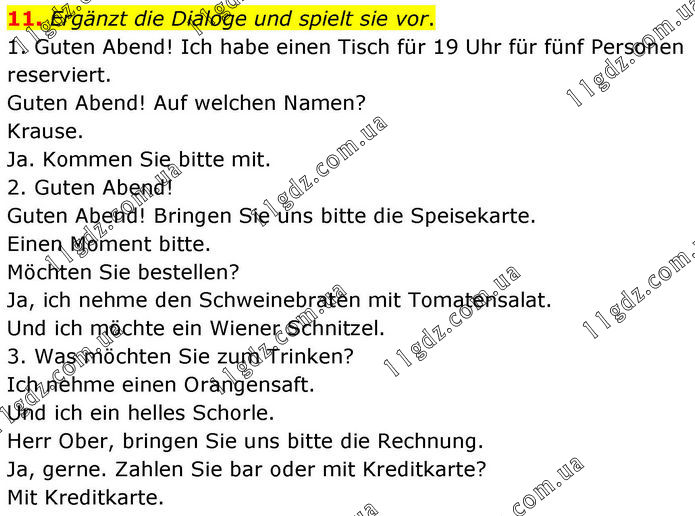 11. Ergänzt die Dialoge und spielt sie vor. 1. Guten Abend! Ich habe einen Tisch für 19 Uhr für fünf Personen reserviert. Guten Abend! Auf welchen Namen? Krause. Ja. Kommen Sie bitte mit. 2. Guten Abend! Guten Abend! Bringen Sie uns bitte die Speisekarte. Einen Moment bitte. Möchten Sie bestellen? Ja, ich nehme den Schweinebraten mit Tomatensalat. Und ich möchte ein Wiener Schnitzel. 3. Was möchten Sie zum Trinken? Ich nehme einen Orangensaft. Und ich ein helles Schorle. Herr Ober, bringen Sie uns bitte die Rechnung. Ja, gerne. Zahlen Sie bar oder mit Kreditkarte? Mit Kreditkarte.