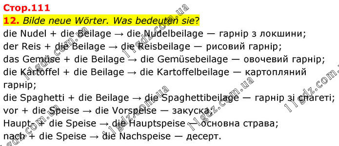 12. Bilde neue Wörter. Was bedeuten sie? die Nudel + die Beilage → die Nudelbeilage — гарнір з локшини; der Reis + die Beilage → die Reisbeilage — рисовий гарнір; das Gemüse + die Beilage → die Gemüsebeilage — овочевий гарнір; die Kartoffel + die Beilage → die Kartoffelbeilage — картопляний гарнір; die Spaghetti + die Beilage → die Spaghettibeilage — гарнір зі спагеті; vor + die Speise → die Vorspeise — закуска; Haupt- + die Speise → die Hauptspeise — основна страва; nach + die Speise → die Nachspeise — десерт.