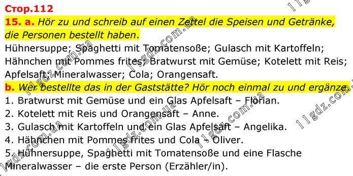 15. a. Hör zu und schreib auf einen Zettel die Speisen und Getränke, die Personen bestellt haben. Hühnersuppe; Spaghetti mit Tomatensoße; Gulasch mit Kartoffeln; Hähnchen mit Pommes frites; Bratwurst mit Gemüse; Kotelett mit Reis; Apfelsaft; Mineralwasser; Cola; Orangensaft. b. Wer bestellte das in der Gaststätte? Hör noch einmal zu und ergänze. 1. Bratwurst mit Gemüse und ein Glas Apfelsaft – Florian. 2. Kotelett mit Reis und Orangensaft – Anne. 3. Gulasch mit Kartoffeln und ein Glas Apfelsaft – Angelika. 4. Hähnchen mit Pommes frites und Cola – Oliver. 5. Hühnersuppe, Spaghetti mit Tomatensoße und eine Flasche Mineralwasser – die erste Person (Erzähler/in).