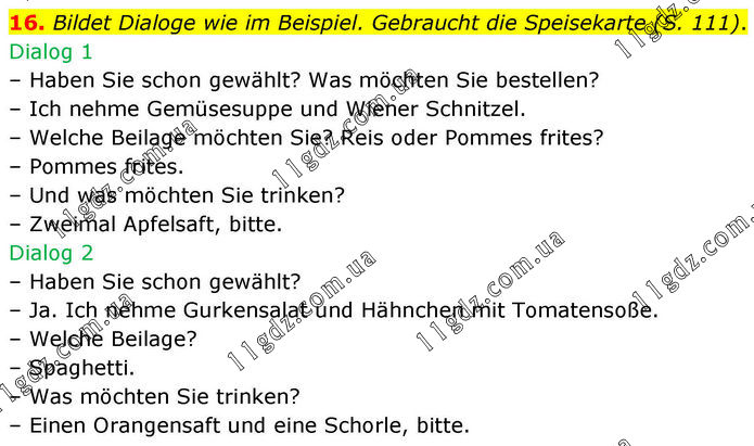 16. Bildet Dialoge wie im Beispiel. Gebraucht die Speisekarte (S. 111). Dialog 1 – Haben Sie schon gewählt? Was möchten Sie bestellen? – Ich nehme Gemüsesuppe und Wiener Schnitzel. – Welche Beilage möchten Sie? Reis oder Pommes frites? – Pommes frites. – Und was möchten Sie trinken? – Zweimal Apfelsaft, bitte. Dialog 2 – Haben Sie schon gewählt? – Ja. Ich nehme Gurkensalat und Hähnchen mit Tomatensoße. – Welche Beilage? – Spaghetti. – Was möchten Sie trinken? – Einen Orangensaft und eine Schorle, bitte.