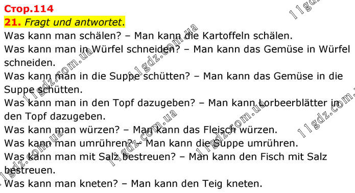 21. Fragt und antwortet. Was kann man schälen? – Man kann die Kartoffeln schälen. Was kann man in Würfel schneiden? – Man kann das Gemüse in Würfel schneiden. Was kann man in die Suppe schütten? – Man kann das Gemüse in die Suppe schütten. Was kann man in den Topf dazugeben? – Man kann Lorbeerblätter in den Topf dazugeben. Was kann man würzen? – Man kann das Fleisch würzen. Was kann man umrühren? – Man kann die Suppe umrühren. Was kann man mit Salz bestreuen? – Man kann den Fisch mit Salz bestreuen. Was kann man kneten? – Man kann den Teig kneten.