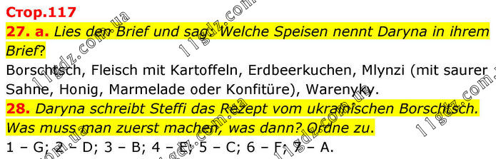 27. a. Lies den Brief und sag: Welche Speisen nennt Daryna in ihrem Brief? Borschtsch, Fleisch mit Kartoffeln, Erdbeerkuchen, Mlynzi (mit saurer Sahne, Honig, Marmelade oder Konfitüre), Warenyky. 28. Daryna schreibt Steffi das Rezept vom ukrainischen Borschtsch. Was muss man zuerst machen, was dann? Ordne zu. 1 – G; 2 – D; 3 – B; 4 – E; 5 – C; 6 – F; 7 – A.