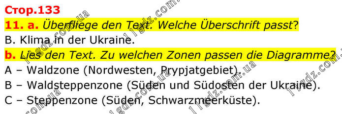 11. a. Überfliege den Text. Welche Überschrift passt? B. Klima in der Ukraine. b. Lies den Text. Zu welchen Zonen passen die Diagramme? A – Waldzone (Nordwesten, Prypjatgebiet). B – Waldsteppenzone (Süden und Südosten der Ukraine). C – Steppenzone (Süden, Schwarzmeerküste).