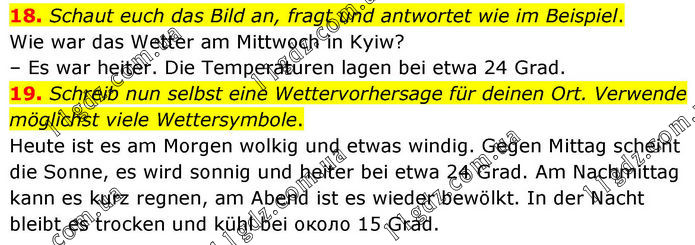 18. Schaut euch das Bild an, fragt und antwortet wie im Beispiel. Wie war das Wetter am Mittwoch in Kyiw? – Es war heiter. Die Temperaturen lagen bei etwa 24 Grad. 19. Schreib nun selbst eine Wettervorhersage für deinen Ort. Verwende möglichst viele Wettersymbole. Heute ist es am Morgen wolkig und etwas windig. Gegen Mittag scheint die Sonne, es wird sonnig und heiter bei etwa 24 Grad. Am Nachmittag kann es kurz regnen, am Abend ist es wieder bewölkt. In der Nacht bleibt es trocken und kühl bei около 15 Grad.