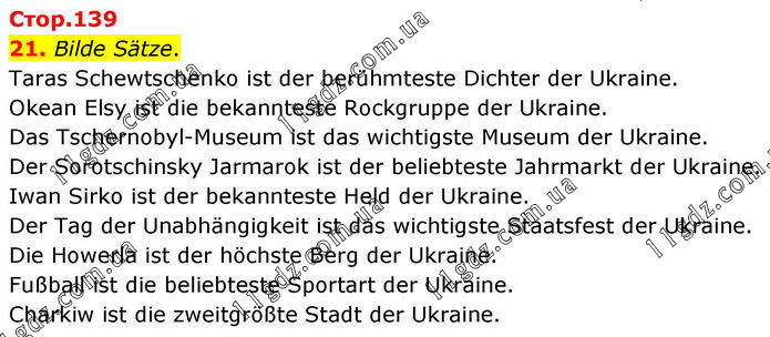 21. Bilde Sätze. Taras Schewtschenko ist der berühmteste Dichter der Ukraine. Okean Elsy ist die bekannteste Rockgruppe der Ukraine. Das Tschernobyl-Museum ist das wichtigste Museum der Ukraine. Der Sorotschinsky Jarmarok ist der beliebteste Jahrmarkt der Ukraine. Iwan Sirko ist der bekannteste Held der Ukraine. Der Tag der Unabhängigkeit ist das wichtigste Staatsfest der Ukraine. Die Howerla ist der höchste Berg der Ukraine. Fußball ist die beliebteste Sportart der Ukraine. Charkiw ist die zweitgrößte Stadt der Ukraine.