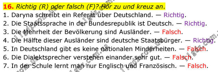 16. Richtig (R) oder falsch (F)? Hör zu und kreuz an. 1. Daryna schreibt ein Referat über Deutschland. — Richtig. 2. Die Staatssprache in der Bundesrepublik ist Deutsch. — Richtig. 3. Die Mehrheit der Bevölkerung sind Ausländer. — Falsch. 4. Die Hälfte dieser Ausländer sind deutsche Staatsbürger. — Richtig. 5. In Deutschland gibt es keine nationalen Minderheiten. — Falsch. 6. Die Dialektsprecher verstehen einander sehr gut. — Falsch. 7. In der Schule lernt man nur Englisch und Französisch. — Falsch.
