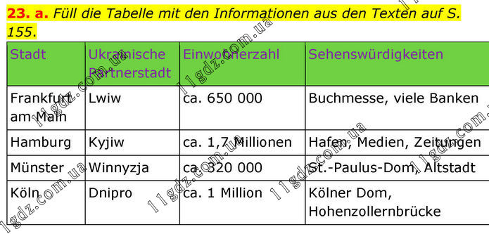 23. a. Füll die Tabelle mit den Informationen aus den Texten auf S. 155. Stadt Ukrainische Partnerstadt Einwohnerzahl Sehenswürdigkeiten Frankfurt am Main Lwiw ca. 650 000 Buchmesse, viele Banken Hamburg Kyjiw ca. 1,7 Millionen Hafen, Medien, Zeitungen Münster Winnyzja ca. 320 000 St.-Paulus-Dom, Altstadt Köln Dnipro ca. 1 Million Kölner Dom, Hohenzollernbrücke