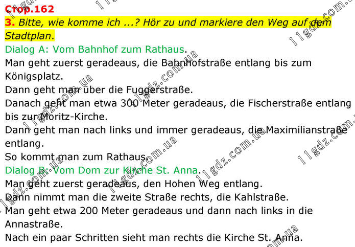 3. Bitte, wie komme ich ...? Hör zu und markiere den Weg auf dem Stadtplan. Dialog A: Vom Bahnhof zum Rathaus. Man geht zuerst geradeaus, die Bahnhofstraße entlang bis zum Königsplatz. Dann geht man über die Fuggerstraße. Danach geht man etwa 300 Meter geradeaus, die Fischerstraße entlang bis zur Moritz-Kirche. Dann geht man nach links und immer geradeaus, die Maximilianstraße entlang. So kommt man zum Rathaus. Dialog B: Vom Dom zur Kirche St. Anna. Man geht zuerst geradeaus, den Hohen Weg entlang. Dann nimmt man die zweite Straße rechts, die Kahlstraße. Man geht etwa 200 Meter geradeaus und dann nach links in die Annastraße. Nach ein paar Schritten sieht man rechts die Kirche St. Anna.