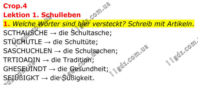 Lektion 1. Schulleben 1. Welche Wörter sind hier versteckt? Schreib mit Artikeln. SCTHAUSCHE → die Schultasche; STÜCHUTLE → die Schultüte; SASCHUCHLEN → die Schulsachen; TRTIOADIN → die Tradition; GHESEUINDT → die Gesundheit; SEIÜßIGKT → die Süßigkeit.
