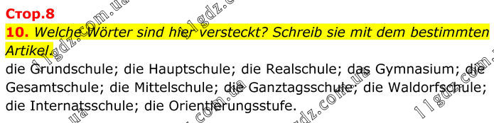 10. Welche Wörter sind hier versteckt? Schreib sie mit dem bestimmten Artikel. die Grundschule; die Hauptschule; die Realschule; das Gymnasium; die Gesamtschule; die Mittelschule; die Ganztagsschule; die Waldorfschule; die Internatsschule; die Orientierungsstufe.