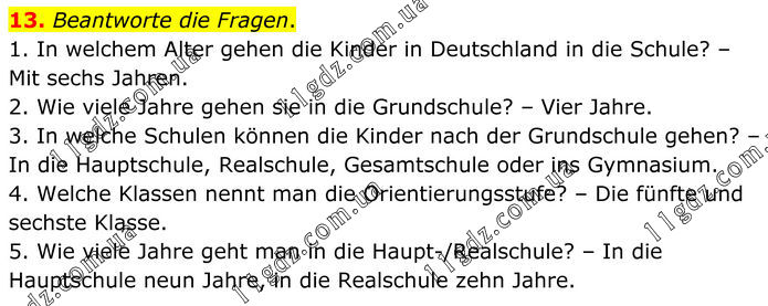 13. Beantworte die Fragen. 1. In welchem Alter gehen die Kinder in Deutschland in die Schule? – Mit sechs Jahren. 2. Wie viele Jahre gehen sie in die Grundschule? – Vier Jahre. 3. In welche Schulen können die Kinder nach der Grundschule gehen? – In die Hauptschule, Realschule, Gesamtschule oder ins Gymnasium. 4. Welche Klassen nennt man die Orientierungsstufe? – Die fünfte und sechste Klasse. 5. Wie viele Jahre geht man in die Haupt–/Realschule? – In die Hauptschule neun Jahre, in die Realschule zehn Jahre.