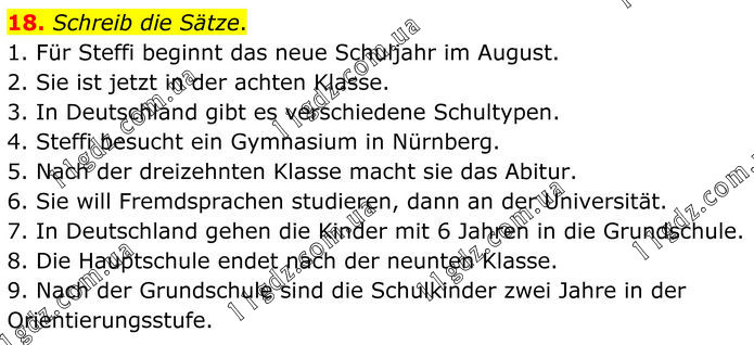 18. Schreib die Sätze. 1. Für Steffi beginnt das neue Schuljahr im August. 2. Sie ist jetzt in der achten Klasse. 3. In Deutschland gibt es verschiedene Schultypen. 4. Steffi besucht ein Gymnasium in Nürnberg. 5. Nach der dreizehnten Klasse macht sie das Abitur. 6. Sie will Fremdsprachen studieren, dann an der Universität. 7. In Deutschland gehen die Kinder mit 6 Jahren in die Grundschule. 8. Die Hauptschule endet nach der neunten Klasse. 9. Nach der Grundschule sind die Schulkinder zwei Jahre in der Orientierungsstufe.