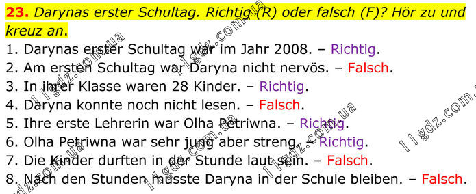 23. Darynas erster Schultag. Richtig (R) oder falsch (F)? Hör zu und kreuz an. 1. Darynas erster Schultag war im Jahr 2008. – Richtig. 2. Am ersten Schultag war Daryna nicht nervös. – Falsch. 3. In ihrer Klasse waren 28 Kinder. – Richtig. 4. Daryna konnte noch nicht lesen. – Falsch. 5. Ihre erste Lehrerin war Olha Petriwna. – Richtig. 6. Olha Petriwna war sehr jung aber streng. – Richtig. 7. Die Kinder durften in der Stunde laut sein. – Falsch. 8. Nach den Stunden musste Daryna in der Schule bleiben. – Falsch.