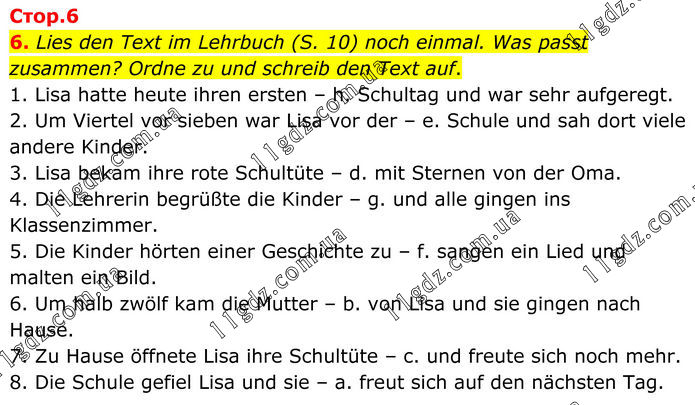 6. Lies den Text im Lehrbuch (S. 10) noch einmal. Was passt zusammen? Ordne zu und schreib den Text auf. 1. Lisa hatte heute ihren ersten – h. Schultag und war sehr aufgeregt. 2. Um Viertel vor sieben war Lisa vor der – e. Schule und sah dort viele andere Kinder. 3. Lisa bekam ihre rote Schultüte – d. mit Sternen von der Oma. 4. Die Lehrerin begrüßte die Kinder – g. und alle gingen ins Klassenzimmer. 5. Die Kinder hörten einer Geschichte zu – f. sangen ein Lied und malten ein Bild. 6. Um halb zwölf kam die Mutter – b. von Lisa und sie gingen nach Hause. 7. Zu Hause öffnete Lisa ihre Schultüte – c. und freute sich noch mehr. 8. Die Schule gefiel Lisa und sie – a. freut sich auf den nächsten Tag.