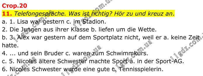11. Telefongespräche. Was ist richtig? Hör zu und kreuz an. a. 1. Lisa war gestern c. im Stadion. 2. Die Jungen aus ihrer Klasse b. liefen um die Wette. b. 3. Alex war gestern auf dem Sportplatz nicht, weil er a. keine Zeit hatte. 4. ... und sein Bruder c. waren zum Schwimmkurs. c. 5. Nicoles ältere Schwester machte Sport a. in der Sport–AG. 6. Nicoles Schwester wurde eine gute c. Tennisspielerin.