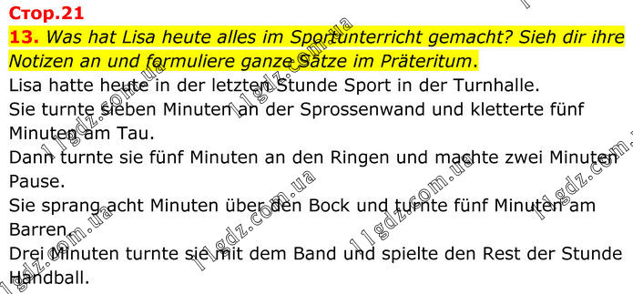13. Was hat Lisa heute alles im Sportunterricht gemacht? Sieh dir ihre Notizen an und formuliere ganze Sätze im Präteritum. Lisa hatte heute in der letzten Stunde Sport in der Turnhalle. Sie turnte sieben Minuten an der Sprossenwand und kletterte fünf Minuten am Tau. Dann turnte sie fünf Minuten an den Ringen und machte zwei Minuten Pause. Sie sprang acht Minuten über den Bock und turnte fünf Minuten am Barren. Drei Minuten turnte sie mit dem Band und spielte den Rest der Stunde Handball.