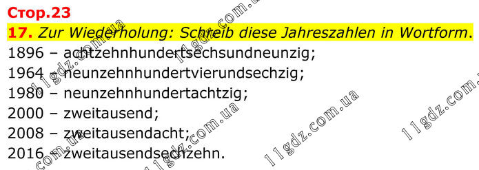 17. Zur Wiederholung: Schreib diese Jahreszahlen in Wortform. 1896 – achtzehnhundertsechsundneunzig; 1964 – neunzehnhundertvierundsechzig; 1980 – neunzehnhundertachtzig; 2000 – zweitausend; 2008 – zweitausendacht; 2016 – zweitausendsechzehn.