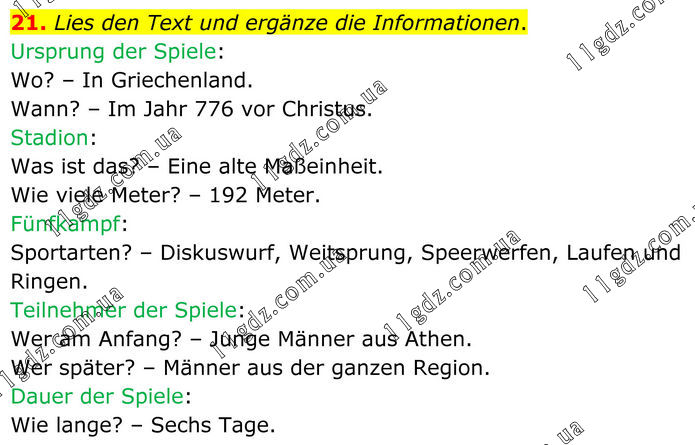 21. Lies den Text und ergänze die Informationen. Ursprung der Spiele: Wo? – In Griechenland. Wann? – Im Jahr 776 vor Christus. Stadion: Was ist das? – Eine alte Maßeinheit. Wie viele Meter? – 192 Meter. Fünfkampf: Sportarten? – Diskuswurf, Weitsprung, Speerwerfen, Laufen und Ringen. Teilnehmer der Spiele: Wer am Anfang? – Junge Männer aus Athen. Wer später? – Männer aus der ganzen Region. Dauer der Spiele: Wie lange? – Sechs Tage.