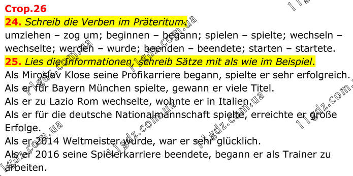 24. Schreib die Verben im Präteritum. umziehen – zog um; beginnen – begann; spielen – spielte; wechseln – wechselte; werden – wurde; beenden – beendete; starten – startete. 25. Lies die Informationen, schreib Sätze mit als wie im Beispiel. Als Miroslav Klose seine Profikarriere begann, spielte er sehr erfolgreich. Als er für Bayern München spielte, gewann er viele Titel. Als er zu Lazio Rom wechselte, wohnte er in Italien. Als er für die deutsche Nationalmannschaft spielte, erreichte er große Erfolge. Als er 2014 Weltmeister wurde, war er sehr glücklich. Als er 2016 seine Spielerkarriere beendete, begann er als Trainer zu arbeiten.