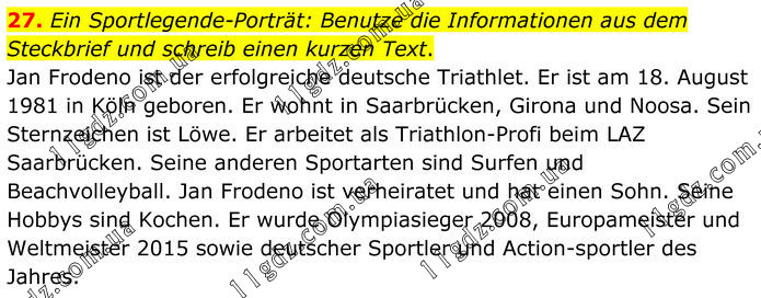 27. Ein Sportlegende–Porträt: Benutze die Informationen aus dem Steckbrief und schreib einen kurzen Text. Jan Frodeno ist der erfolgreiche deutsche Triathlet. Er ist am 18. August 1981 in Köln geboren. Er wohnt in Saarbrücken, Girona und Noosa. Sein Sternzeichen ist Löwe. Er arbeitet als Triathlon–Profi beim LAZ Saarbrücken. Seine anderen Sportarten sind Surfen und Beachvolleyball. Jan Frodeno ist verheiratet und hat einen Sohn. Seine Hobbys sind Kochen. Er wurde Olympiasieger 2008, Europameister und Weltmeister 2015 sowie deutscher Sportler und Actionsportler des Jahres.