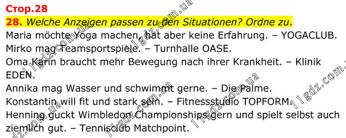 28. Welche Anzeigen passen zu den Situationen? Ordne zu. Maria möchte Yoga machen, hat aber keine Erfahrung. – YOGACLUB. Mirko mag Teamsportspiele. – Turnhalle OASE. Oma Karin braucht mehr Bewegung nach ihrer Krankheit. – Klinik EDEN. Annika mag Wasser und schwimmt gerne. – Die Palme. Konstantin will fit und stark sein. – Fitnessstudio TOPFORM. Henning guckt Wimbledon Championships gern und spielt selbst auch ziemlich gut. – Tennisclub Matchpoint.