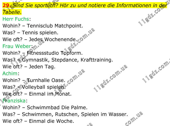 29. Sind Sie sportlich? Hör zu und notiere die Informationen in der Tabelle. Herr Fuchs: Wohin? – Tennisclub Matchpoint. Was? – Tennis spielen. Wie oft? – Jedes Wochenende. Frau Weber: Wohin? – Fitnessstudio Topform. Was? – Gymnastik, Stepdance, Krafttraining. Wie oft? – Jeden Tag. Achim: Wohin? – Turnhalle Oase. Was? – Volleyball spielen. Wie oft? – Einmal im Monat. Franziska: Wohin? – Schwimmbad Die Palme. Was? – Schwimmen, Rutschen, Spielen im Wasser. Wie oft? – Einmal die Woche.