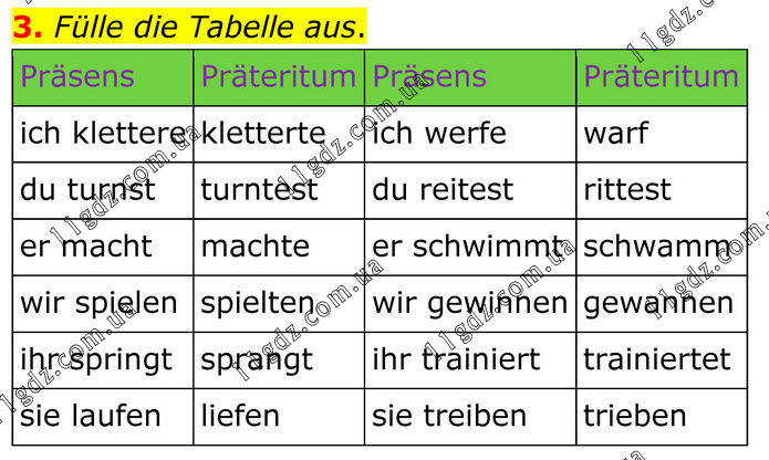 3. Fülle die Tabelle aus. Präsens Präteritum Präsens Präteritum ich klettere kletterte ich werfe warf du turnst turntest du reitest rittest er macht machte er schwimmt schwamm wir spielen spielten wir gewinnen gewannen ihr springt sprangt ihr trainiert trainiertet sie laufen liefen sie treiben trieben