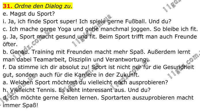 31. Ordne den Dialog zu. e. Magst du Sport? i. Ja, ich finde Sport super! Ich spiele gerne Fußball. Und du? c. Ich mache gerne Yoga und gehe manchmal joggen. So bleibe ich fit. g. Ja, Sport macht gesund und fit. Beim Sport trifft man auch Freunde öfter. b. Genau. Training mit Freunden macht mehr Spaß. Außerdem lernt man dabei Teamarbeit, Disziplin und Verantwortung. f. Da stimme ich dir absolut zu! Sport ist nicht nur für die Gesundheit gut, sondern auch für die Karriere in der Zukunft. a. Welchen Sport möchtest du vielleicht noch ausprobieren? h. Vielleicht Tennis. Es sieht interessant aus. Und du? d. Ich möchte gerne Reiten lernen. Sportarten auszuprobieren macht immer Spaß!