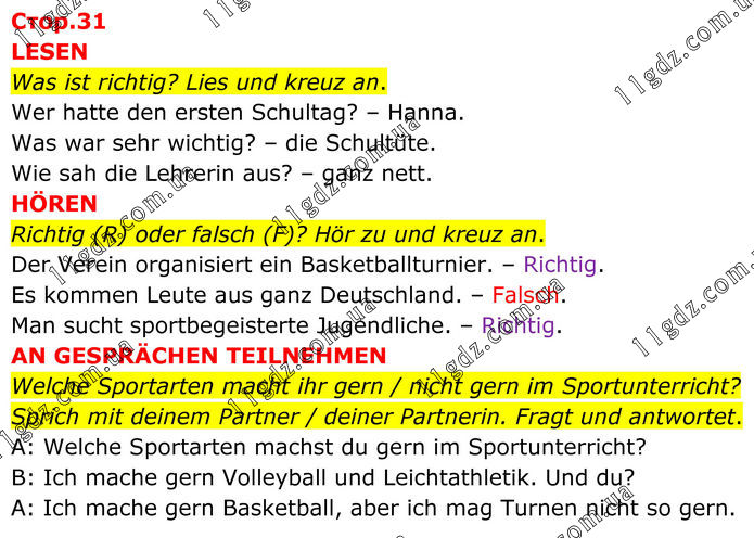 LESEN Was ist richtig? Lies und kreuz an. Wer hatte den ersten Schultag? – Hanna. Was war sehr wichtig? – die Schultüte. Wie sah die Lehrerin aus? – ganz nett. HÖREN Richtig (R) oder falsch (F)? Hör zu und kreuz an. Der Verein organisiert ein Basketballturnier. – Richtig. Es kommen Leute aus ganz Deutschland. – Falsch. Man sucht sportbegeisterte Jugendliche. – Richtig. AN GESPRÄCHEN TEILNEHMEN Welche Sportarten macht ihr gern / nicht gern im Sportunterricht? Sprich mit deinem Partner / deiner Partnerin. Fragt und antwortet. A: Welche Sportarten machst du gern im Sportunterricht? B: Ich mache gern Volleyball und Leichtathletik. Und du? A: Ich mache gern Basketball, aber ich mag Turnen nicht so gern.