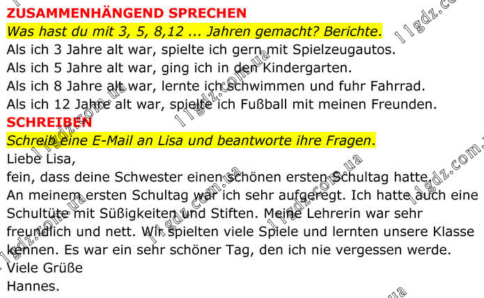 ZUSAMMENHÄNGEND SPRECHEN Was hast du mit 3, 5, 8,12 ... Jahren gemacht? Berichte. Als ich 3 Jahre alt war, spielte ich gern mit Spielzeugautos. Als ich 5 Jahre alt war, ging ich in den Kindergarten. Als ich 8 Jahre alt war, lernte ich schwimmen und fuhr Fahrrad. Als ich 12 Jahre alt war, spielte ich Fußball mit meinen Freunden. SCHREIBEN Schreib eine E–Mail an Lisa und beantworte ihre Fragen. Liebe Lisa, fein, dass deine Schwester einen schönen ersten Schultag hatte. An meinem ersten Schultag war ich sehr aufgeregt. Ich hatte auch eine Schultüte mit Süßigkeiten und Stiften. Meine Lehrerin war sehr freundlich und nett. Wir spielten viele Spiele und lernten unsere Klasse kennen. Es war ein sehr schöner Tag, den ich nie vergessen werde. Viele Grüße Hannes.