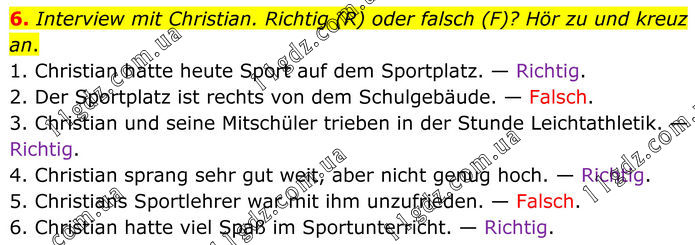 6. Interview mit Christian. Richtig (R) oder falsch (F)? Hör zu und kreuz an. 1. Christian hatte heute Sport auf dem Sportplatz. — Richtig. 2. Der Sportplatz ist rechts von dem Schulgebäude. — Falsch. 3. Christian und seine Mitschüler trieben in der Stunde Leichtathletik. — Richtig. 4. Christian sprang sehr gut weit, aber nicht genug hoch. — Richtig. 5. Christians Sportlehrer war mit ihm unzufrieden. — Falsch. 6. Christian hatte viel Spaß im Sportunterricht. — Richtig.
