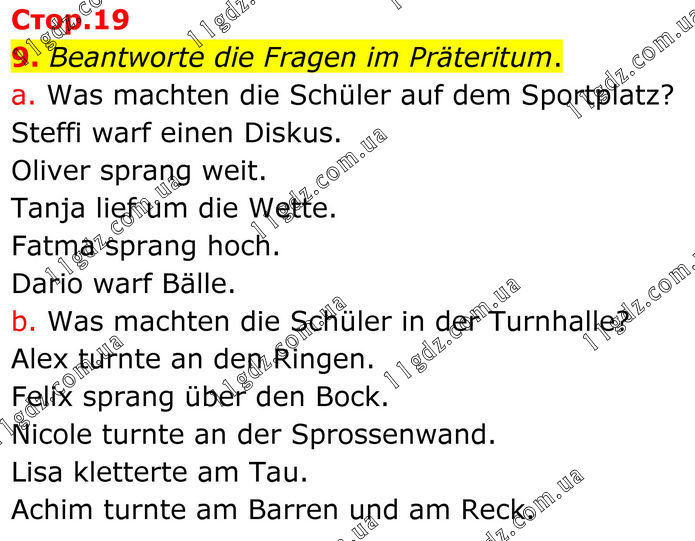9. Beantworte die Fragen im Präteritum. a. Was machten die Schüler auf dem Sportplatz? Steffi warf einen Diskus. Oliver sprang weit. Tanja lief um die Wette. Fatma sprang hoch. Dario warf Bälle. b. Was machten die Schüler in der Turnhalle? Alex turnte an den Ringen. Felix sprang über den Bock. Nicole turnte an der Sprossenwand. Lisa kletterte am Tau. Achim turnte am Barren und am Reck.
