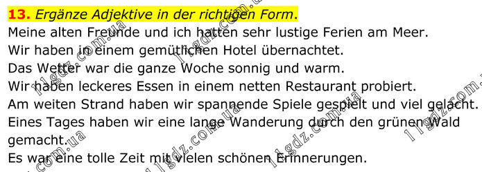 13. Ergänze Adjektive in der richtigen Form. Meine alten Freunde und ich hatten sehr lustige Ferien am Meer. Wir haben in einem gemütlichen Hotel übernachtet. Das Wetter war die ganze Woche sonnig und warm. Wir haben leckeres Essen in einem netten Restaurant probiert. Am weiten Strand haben wir spannende Spiele gespielt und viel gelacht. Eines Tages haben wir eine lange Wanderung durch den grünen Wald gemacht. Es war eine tolle Zeit mit vielen schönen Erinnerungen.