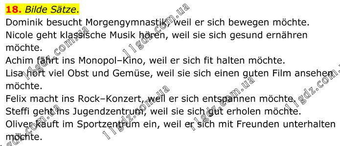 18. Bilde Sätze. Dominik besucht Morgengymnastik, weil er sich bewegen möchte. Nicole geht klassische Musik hören, weil sie sich gesund ernähren möchte. Achim fährt ins Monopol–Kino, weil er sich fit halten möchte. Lisa hört viel Obst und Gemüse, weil sie sich einen guten Film ansehen möchte. Felix macht ins Rock–Konzert, weil er sich entspannen möchte. Steffi geht ins Jugendzentrum, weil sie sich gut erholen möchte. Oliver kauft im Sportzentrum ein, weil er sich mit Freunden unterhalten möchte.