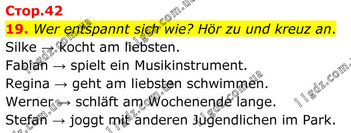 19. Wer entspannt sich wie? Hör zu und kreuz an. Silke → kocht am liebsten. Fabian → spielt ein Musikinstrument. Regina → geht am liebsten schwimmen. Werner → schläft am Wochenende lange. Stefan → joggt mit anderen Jugendlichen im Park.